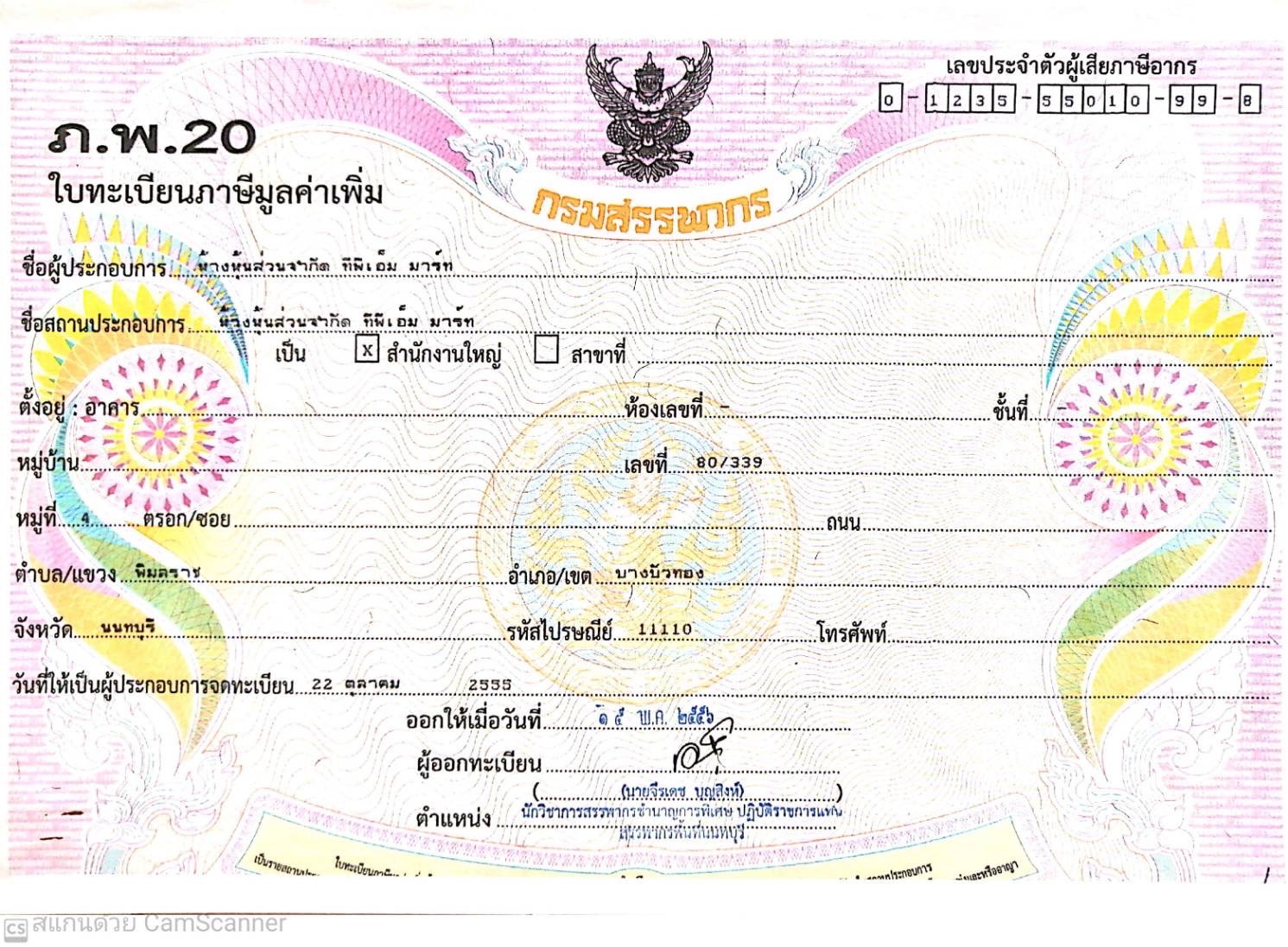 เลขประจำตัวผู้เสียภาษี 0123555010998