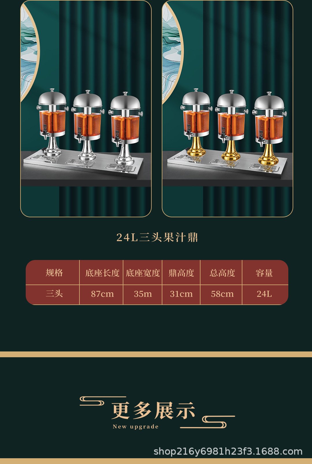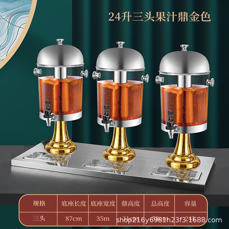 เป็นเครื่องจ่ายน้ำผลไม้แบบ 3 หัว ใช้สำหรับตั้งบนโต๊ะบุฟเฟต์หรือในร้านอาหาร ตัวเครื่องมีให้เลือก 2 สี — แบบฐานเงินและฐานทอง ตัวถังใสสามารถมองเห็นน้ำผลไม้ภายใน เหมาะสำหรับใช้งานในโรงแรม ร้านอาหาร หรือร้านกาแฟ